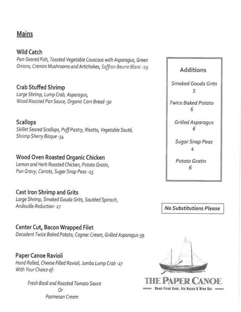 In conclusion, the Paper Canoe Menu offers a unique and exciting dining experience with a variety of delicious dishes and innovative flavors. Whether you're a seafood lover, steak enthusiast, or vegetarian, there is something for everyone on the menu. So why settle for the same old boring options when you can try something new and exciting at the Paper Canoe Menu?
